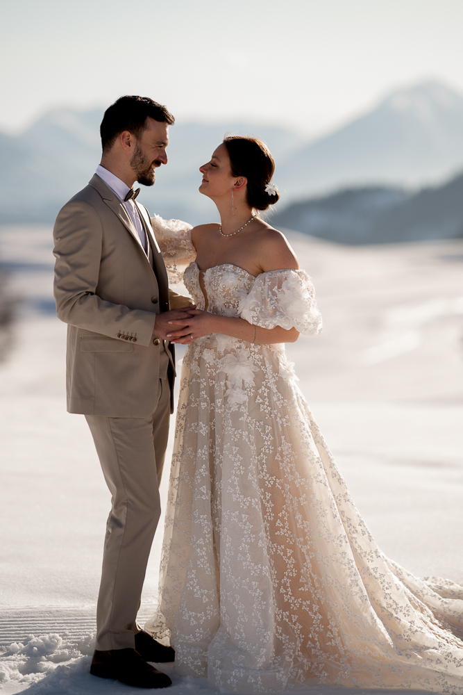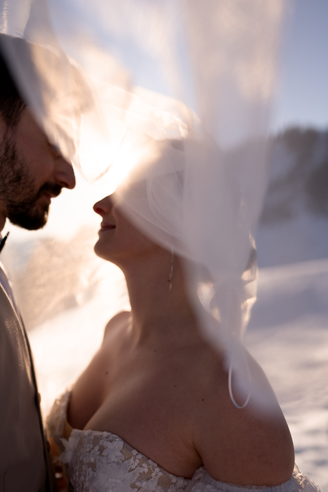 Marion, sublime dans sa robe de mariage, contrastait magnifiquement avec le paysage hivernal. Benjamin, élégant et complice, ne la quittait pas des yeux. Entre éclats de rire, regards tendres et moments suspendus, cette séance après mariage était chargée d’émotions sincères.